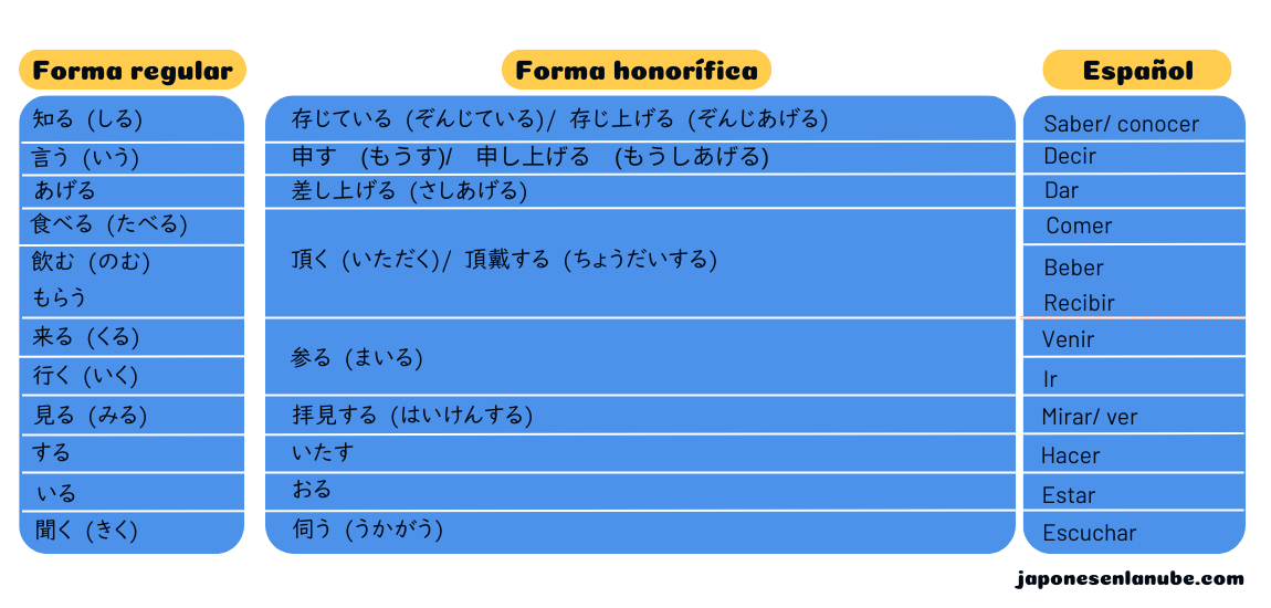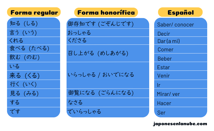 Algunos verbos, tienen su propia forma honorífica específica, diferente a las estructuras que hemos visto hace un momento (es importante que nos los aprendamos):